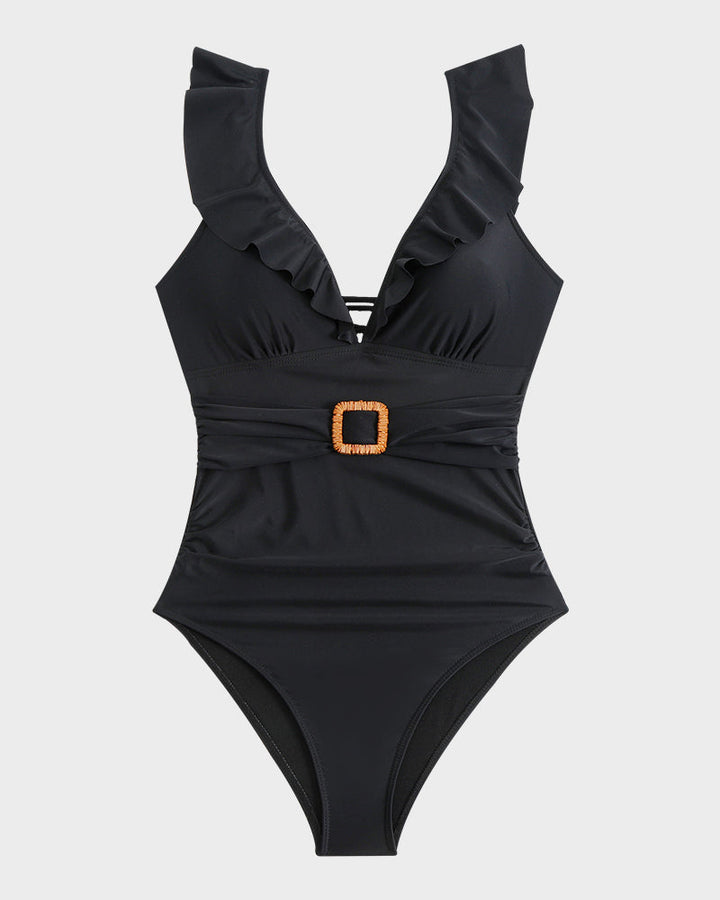 The ruffled sleeves add a playful and romantic flair, making this swimsuit stand out in any setting.Stylish Belt Detailing