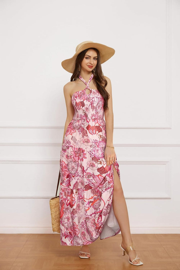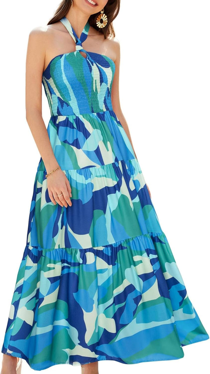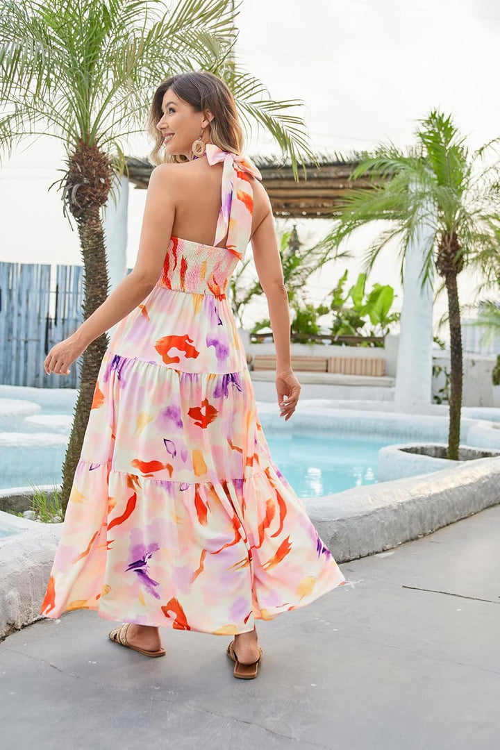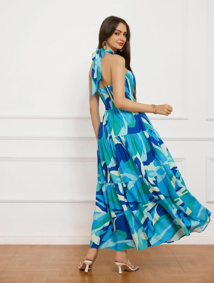 Women's Halter Neck Backless Tie Smocked Ruffle Maxi Dresses