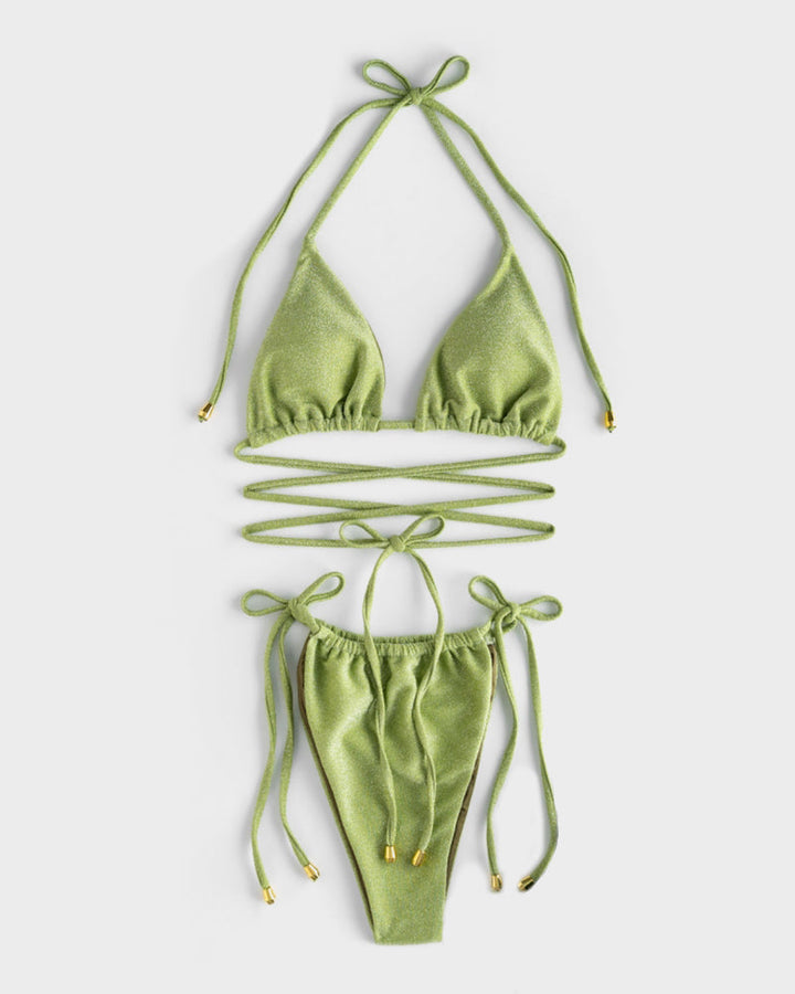 Introducing the Halter Tie Strappy Ruched Bikini Set, a fashionable and flattering choice for your beach or poolside adventures. This bikini set combines stylish design with comfort, ensuring you feel confident and chic all summer long.