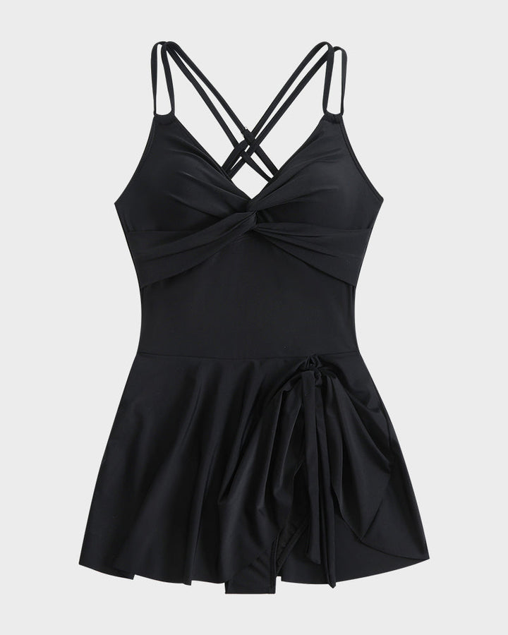 The swim dress style offers added coverage while maintaining a fashionable silhouette, perfect for both swimming and lounging.Flattering Knot Hem Detail