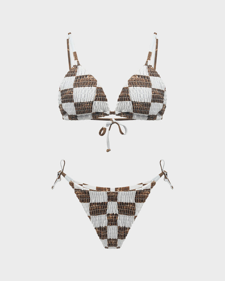 Introducing the Trendy Ruched Check Print Triangle Bikini Set, a chic and stylish choice for your summer adventures. This bikini set features a fashionable check print with ruched detailing, combining comfort and elegance for a standout beach look.